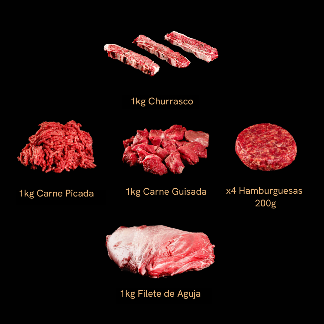 Lote ternera de caserío que incluye: 1kg de carne de guisar, 1kg de carne picada, 1kg de churrasco, 1kg de filetes de aguja, 4 hamburguesas de 200gr; y de regalo 1/2 docena de huevos ecológicos.